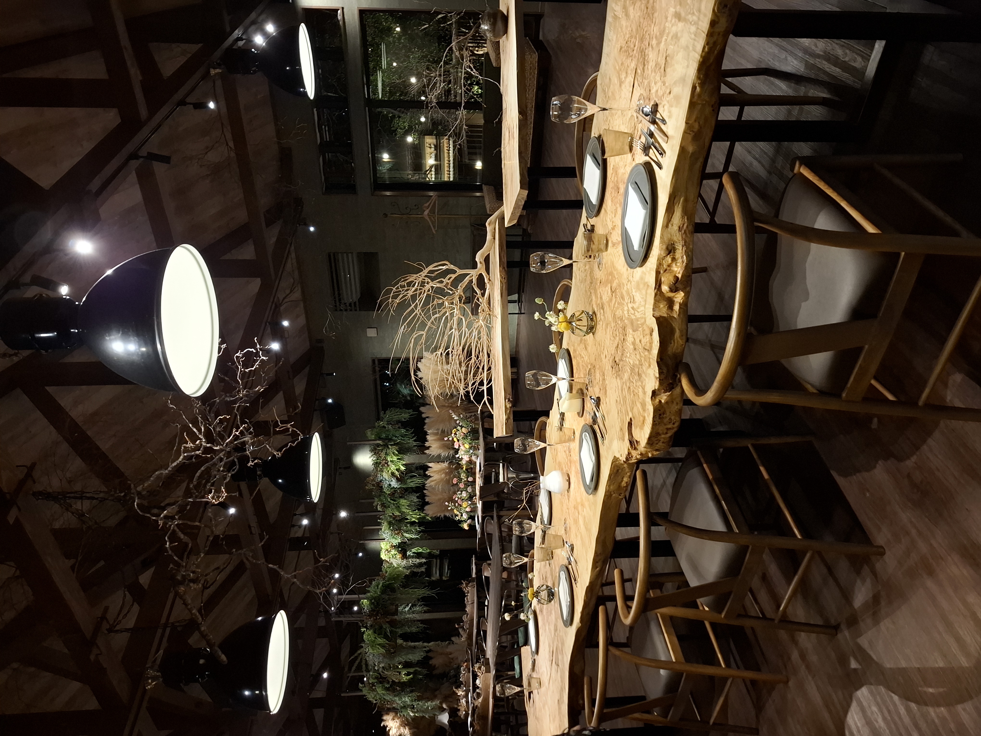 夜幕臨近,窗外的樹影漸濃,SSH No.02餐廳Shola偌大的玻璃趟門,模糊了空間邊界,彷彿與遠處的松樹連成一片森林。側柱支撐著主椽,其上是條木交錯的桁架結構,整體以實木為色。