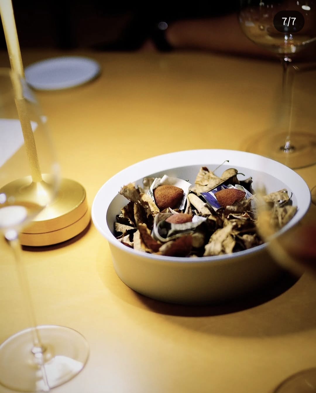 菜單上最後一道菜為烤甜薯,餐盤上擺滿了枯葉,報紙包著迷你烤甜薯,據說,岡本將士先將甜薯搗碎,同時烤薯皮,然後將烤好的皮灑在薯茸表面,製成迷你烤甜薯。這種做法能夠突顯出甜薯本身的天然甜味,亦能讓人感受到嚴寒下以食取暖的溫度。