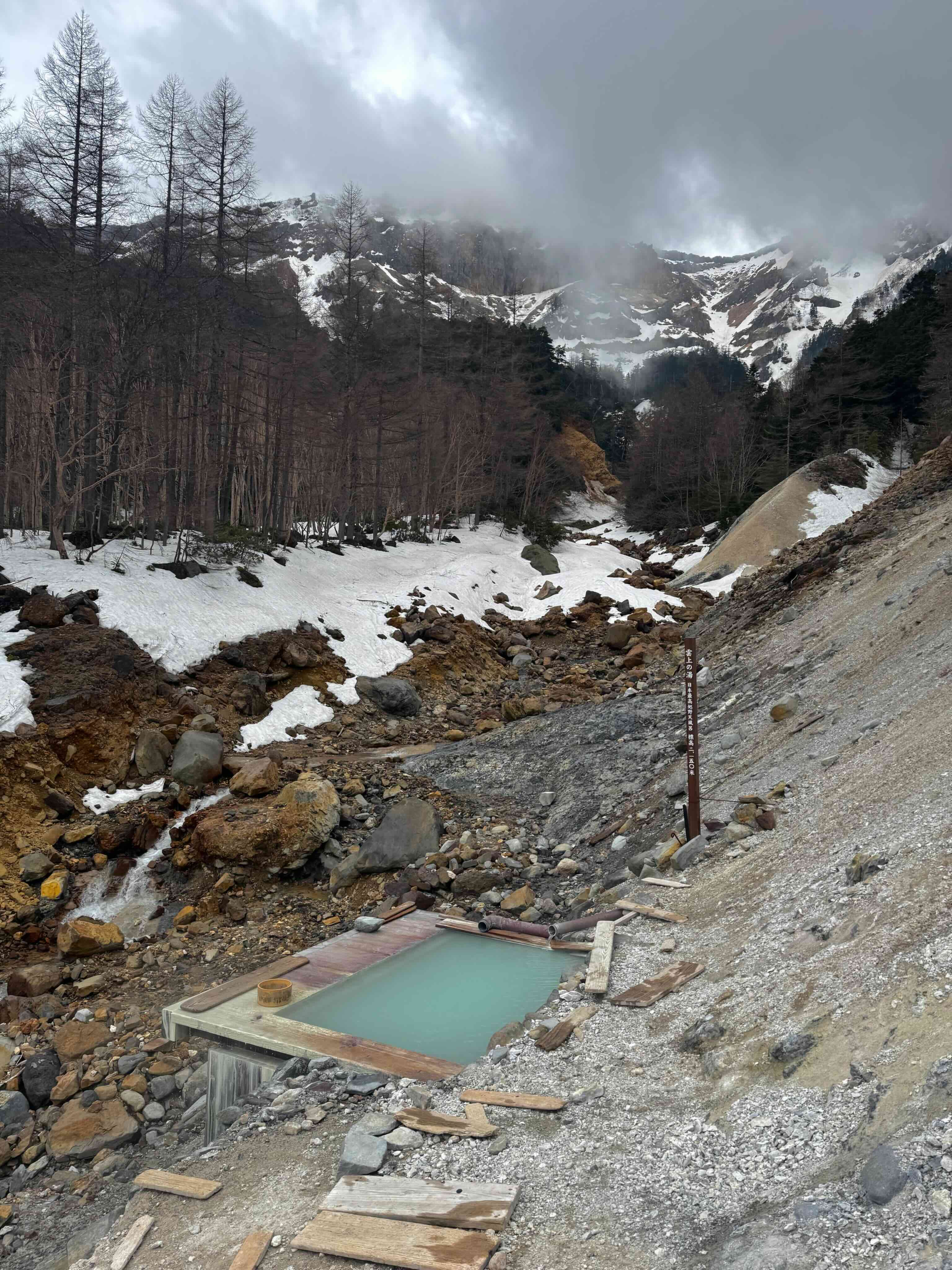 溫泉循水管源源不斷地湧入由木板搭起的浴池,待身體適應滾燙的水溫後,我把整個人浸泡其中,倚靠池邊。溫泉的暖意滲透進疲憊的肌肉深處,驅走沿路以來所有的寒冷與狼狽。冷風輕拂,眼前的積層雲緩緩而過,樹枝在冷風中碰撞,溪流沖刷著石塊而變道。與上周身處的混凝土森林,彷如隔世。