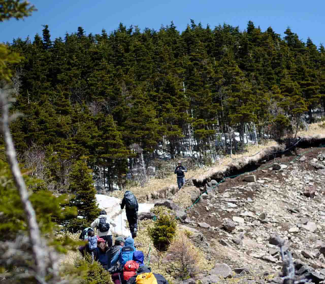 沿路上,我們穿過了無數的落葉松與冷杉交替的樹林,低矮的笹類和葉片倒垂的短果杜鵑灌木叢生,時而走進開闊的空間,又一再邁入被大雪壓斷而殘枝盡露的針葉林。冷風清勁,昨天的雪已融化成水,滋養著土壤及其上的青苔和毛帽蘚,行山鞋沾滿泥漿。