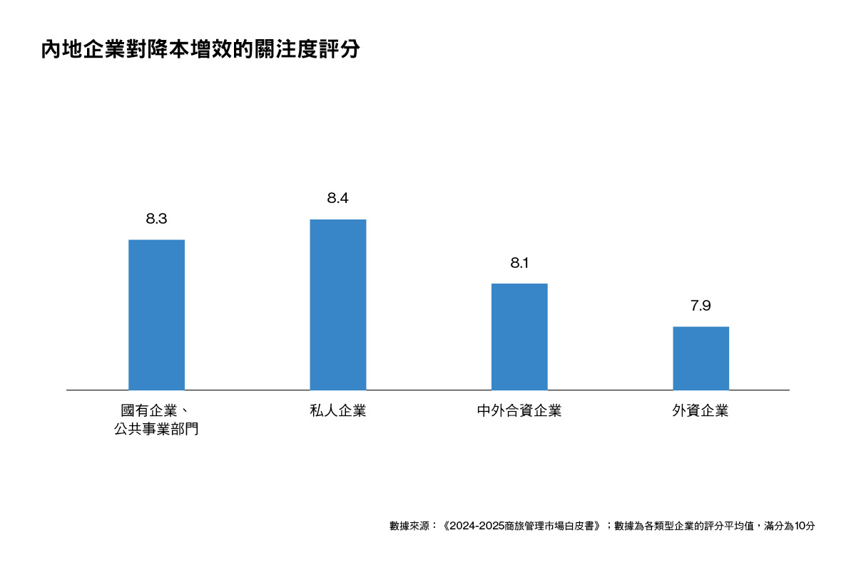 攜程商旅去年發布的《2024-2025年商旅管理白皮書》(下稱《白皮書》)中也反映了這種趨勢。在合共113頁的報告中,有26頁是名為《「優本增效」實戰手冊》的「特刊」。簡而言之,這間中國商務旅行管理龍頭公司在年度旗艦報告中,用了將近四分之一的篇幅來教企業差旅採購人員如何管理化支出,提高效率。而《白皮書》對中國企業的調查結果顯示,私人企業對商務旅行「降本增效」的關注度最高,達到8.4分(滿分10分),而關注度最低的外資企業也評至7.9分。