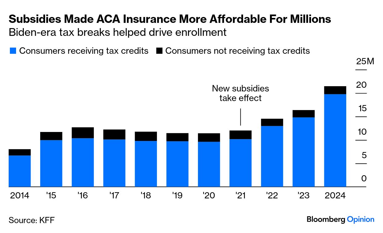 《平價醫療法案》中一直設有按收入浮動的稅收抵免條款,而在拜登政府時期,這一政策的力度顯著提升,抵免變得更加慷慨。自2021年起,這些額外福利不僅降低了人們的參保成本,還擴大了符合獲得資助條件的人群範圍。醫保突然變得讓更多美國人觸手可及,而事實上,五分之四的參保人都有資格獲得每月僅需10美元的保險計劃。