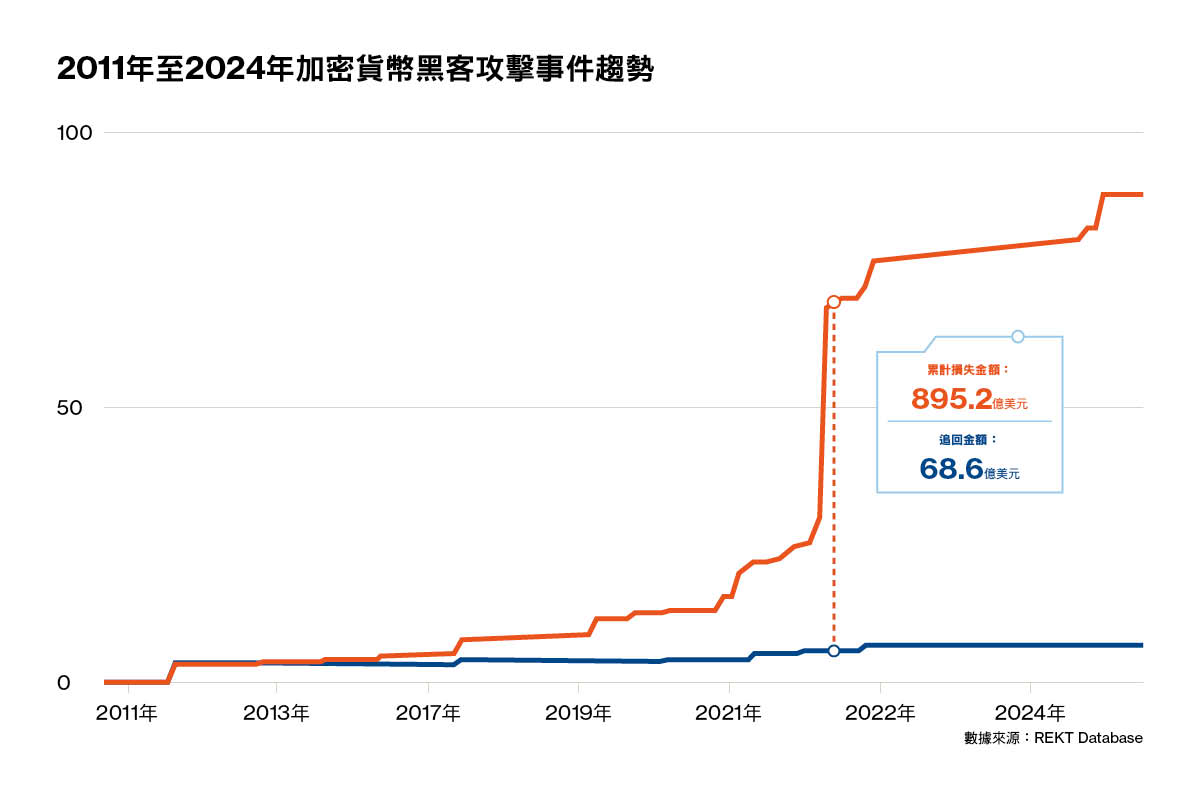 彼時正值首次代幣發行(ICO)的淘金期,如今大名鼎鼎的幣安(Binance)、歐易(OKEx,後改名為OKX)、Kucoin等加密交易所相繼成立。在資金湧入市場,而發幣融資、炒賣等一二級市場成形的同時,黑客攻擊的頻次及嚴重性也在與日俱增。Chainalysis的報告顯示,2018年全年的加密資產被盜金額由前一年的2.49億美元,翻逾五倍至15億美元。
