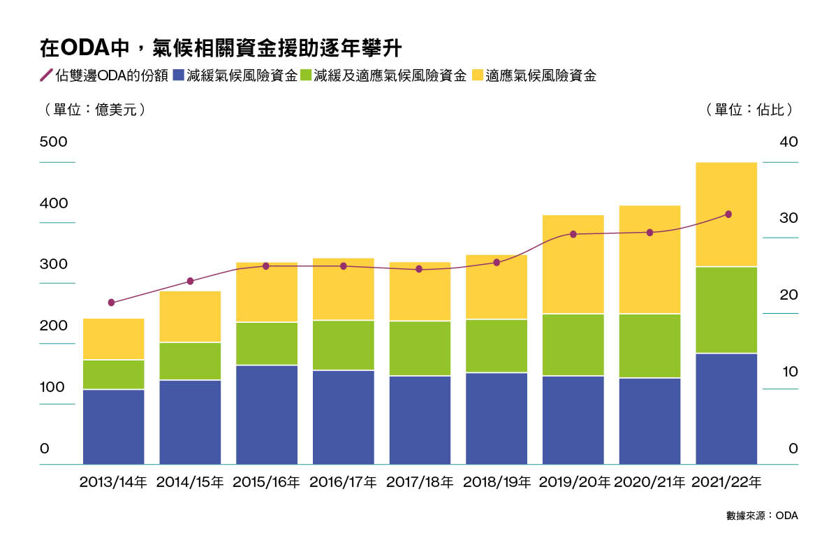 但嚴重的資助收縮不僅帶來人道主義危機,更衝擊著全球的氣候承諾。OECD一份報告曾指出,全球ODA資金中與氣候相關的比例逐年上升,在2021至2022年有近四成資助都是與氣候轉型相關;其中,亞洲地區接受的氣候資助最多,達到180億美元。