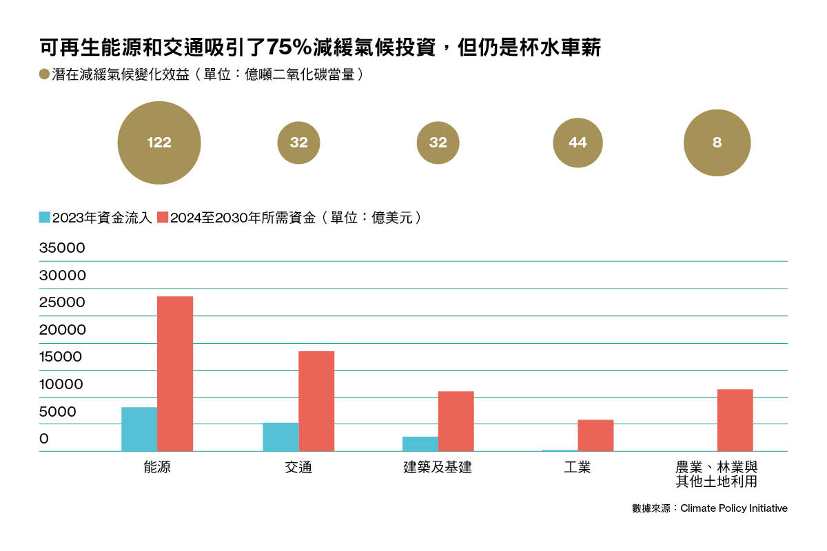 雖然挑戰重重,在ESG相關投資中,可再生能源依然是最受歡迎的類別。根據Climate Policy Initiative在2025年發布的報告,有75%減緩氣候風險投資(mitigation finance)流入可再生能源和交通行業。雖然,可再生能源行業在2023年吸引的投資已較三年前升了一倍,但未來六年仍需要2.5倍的升幅,才能滿足2030年的氣候目標。但報告亦強調,能源是最具減碳潛力的行業,有122億噸二氧化碳當量的減排空間。