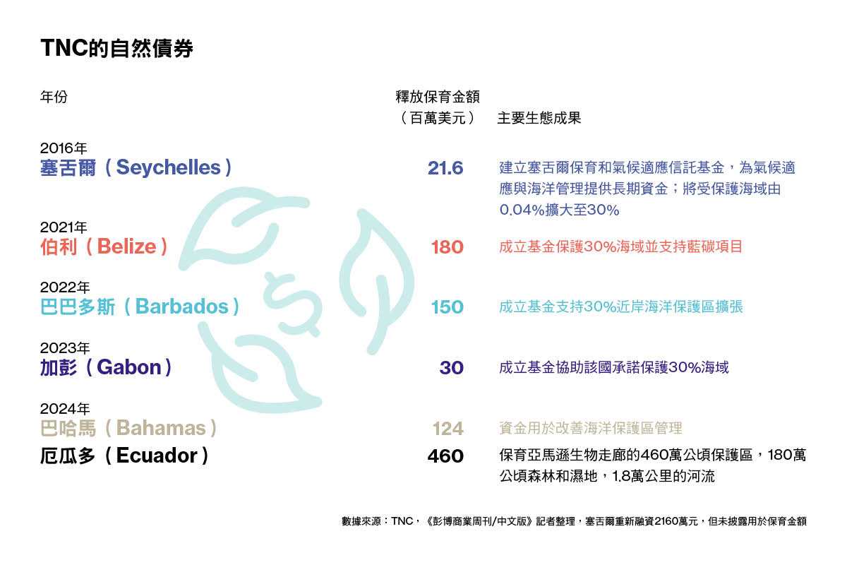 而除了碳信用額以外,NbS等環境保育項目亦曾有過其他創新融資機制應用。非牟利組織大自然保育協會(The Nature Conservancy,下稱TNC)是這方面的先行者。早於2016年,TNC在塞舌爾(Seychelles)試點了首宗「為自然轉換債務」(Debt-for-Nature Swap)交易。TNC牽頭與巴黎俱樂部(Paris Club)債權國及世界銀行合作,協助塞舌爾以較低利率重新融資約2160萬美元的外債,而節省下的債務費用成立新信託基金,長期投入海洋管理,令塞舌爾的受保護海域從原本的 0.04%擴大至30%。