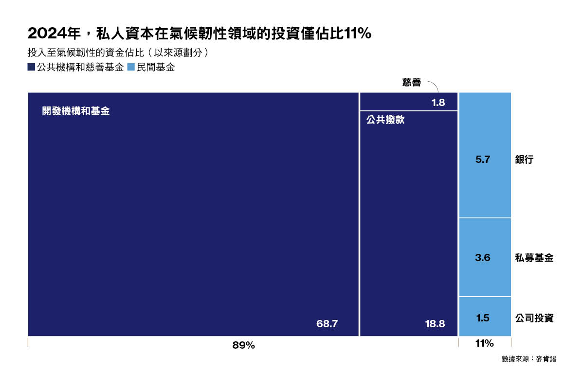 麥肯錫分析,對投資者具有吸引力的氣候科技首先要有成熟的解決方案,其次是具短期韌性效益(例如有效預防和減少近期的經濟損失),以及市場增長潛力等。