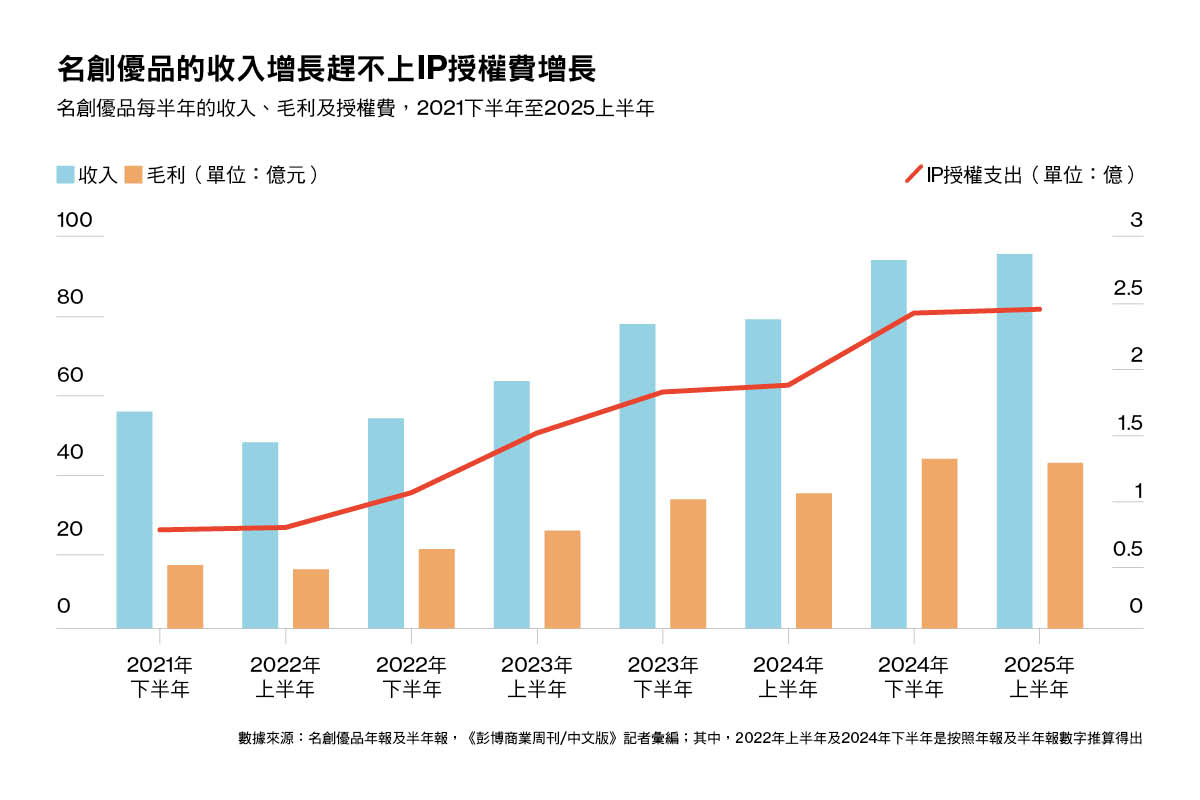 然而,跟收入一起增長的,是公司在IP授權上的費用支出。根據財報數據,在2025年上半年,公司的IP授權費用支出為2.4億元,較2021年下半年的7390萬元翻了三倍有多。而IP授權費用佔收入的比例,也從先前的1.4%逐年攀升,到如今的2.6%。作為對比,競爭對手泡泡瑪特今年的半年報中顯示,公司自有IP產品收入佔比高達88.1%,毛利率超過70%。
